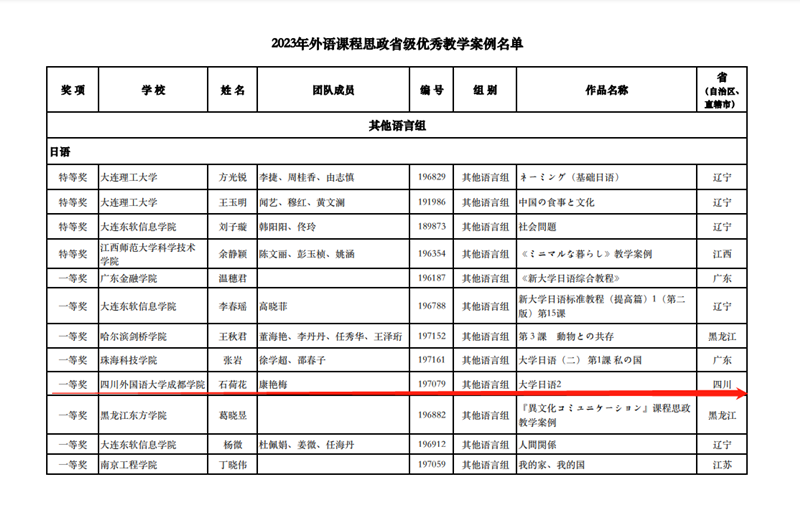 近日,2023年外语课程思政优秀教学案例征集与交流活动公布省级优秀教学案例名单,开云APP(中国)官方下载 亚非语言学院日语专业教师石荷花、康艳梅的参赛作品《社会問題》获得其他语言组四川省一等奖,这是近年来开云APP(中国)官方下载 日语专业在以赛促教方面取得的又一突破性成绩。