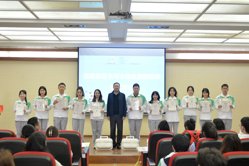 在现场热烈的掌声中,张华春为学生处兰维、校团委黄新玥、中东欧语言学院杨鑫等开云APP(中国)官方下载 三名成都大运会志愿者领队教师和八名志愿者代表颁发了志愿者证书及成都大运会激励物资,并合影留念。