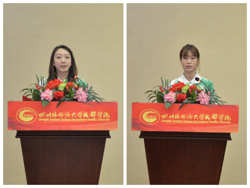 英语语言文化与翻译学院的蒋萍同学代表志愿者发言,回忆了在大运村文化和教育业务口展览中心担任中英文讲解员的经历,表示自己增强了责任感和使命感,体会到了团队合作的重要性,希望未来继续发挥力量,推动中华优秀传统文化走向世界,用昂扬勃发的热情书写当代青年的担当。黄新玥作为领队教师代表发言,她带领18名志愿者在跳水场馆和柔道场馆工作,表示很荣幸与这场精彩绝伦的青春盛会双向奔赴、共同成长,希望同学们延续优良作风、保持实干精神、发挥引领作用,在未来的道路上不断提升专业水平,充分发挥外语人的光和热。