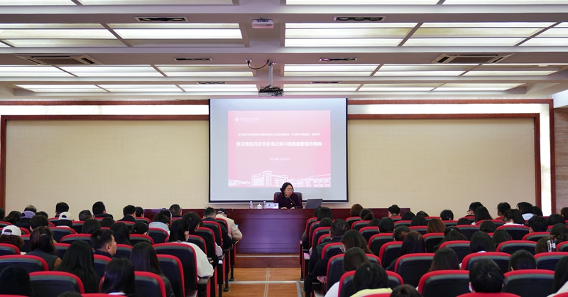 11月29日下午,开云APP(中国)官方下载 开展学习贯彻习近平新时代中国特色社会主义思想主题教育“牢记嘱托 感恩奋进”专题学习,邀请成都师范学院马克思主义学院副院长、四川省级思政示范课程《中国近现代史纲要》负责人、省委宣讲团成员、省委组织部党的二十大精神干部教育培训师资库专家吴静教授在学术报告厅作了题目为《学习贯彻习近平总书记来川视察重要指示精神》的报告。学校党委书记杨继瑞,机关职能部门和二级学院负责人,思政课教师、基层党支部书记,师生党员代表近300人现场参会。