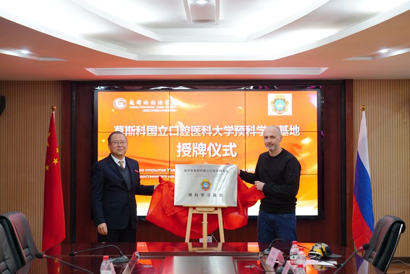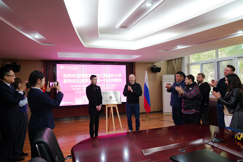 在现场热烈的掌声中,沈光临和扎波罗夫斯基为俄罗斯莫斯科国立口腔医科大学预科学习基地揭牌,双方互赠纪念品并合影留念。会谈结束后,预科学习基地的首批学生代表黄玺烨用俄语与扎波罗夫斯基副校长进行了简单交流,展示了语言学习成果,受到了扎波罗夫斯基副校长的赞赏和鼓励。