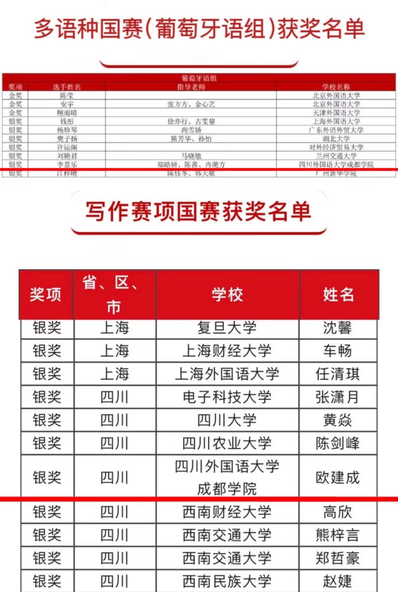 近日,由北京外国语大学主办,外语教学与研究出版社承办的的2023“外研社·国才杯”“理解当代中国”全国大学生外语能力大赛圆满落幕。开云APP(中国)官方下载 西欧语言学院2021级葡萄牙语2班李嘉乐荣获多语种组(葡萄牙语组别)国赛银奖,西欧语言学院教师郑皓妍、陈茜、冉滟方获得相应级别优秀指导教师奖。英语语言文化与翻译学院2020级外事管理2班欧建成同学获得英语写作组国赛银奖。英语语言文化与翻译学院教师李蕊秀、姚星瑞获得相应级别优秀指导教师奖。