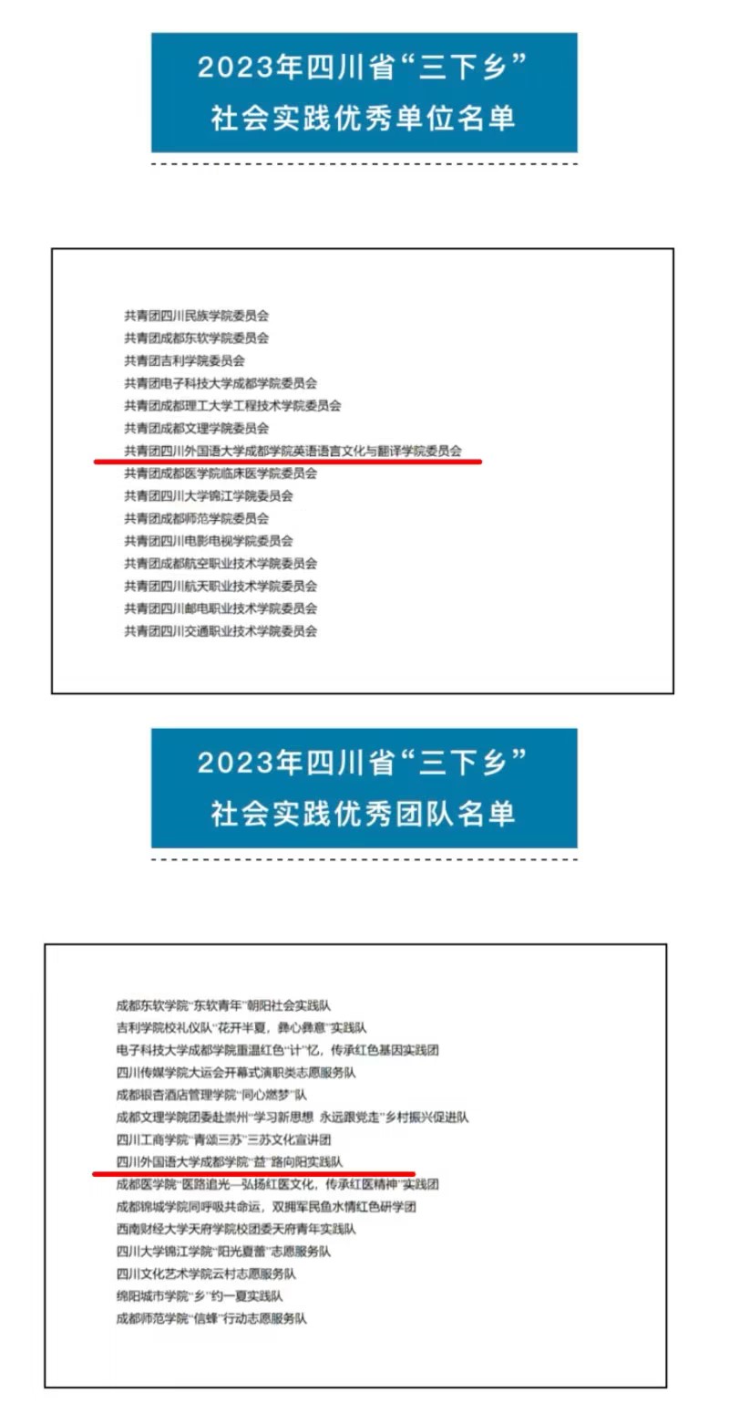 12月7日,2023年四川省大中专学生志愿者暑期文化科技卫生“三下乡”社会实践活动优秀单位和团队评选结果揭晓。开云APP(中国)官方下载 英语语言文化与翻译学院团委被评为2023年四川省“三下乡”社会实践优秀单位,国际商学院“益”路向阳实践队被评为2023年四川省“三下乡”社会实践优秀团队。