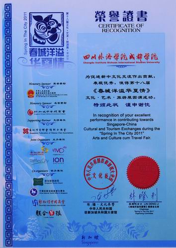 活动结束时,主办方为我院同学举行了隆重的表彰宴会,邀请了中国驻新加坡大使馆文化参赞陈疆为同学们颁奖。经主办方评选,陈丽蓉同学被评为“vivo city最佳学员”,王盼盼和张萍同学被评为“优秀学员”,邓淞、王照东、王亚骁、唐华4名同学荣获“全程协助奖”,所有参加实习的同学都获得了实习证书。中国驻新加坡大使馆文化处和新加坡“春城洋溢华夏情”筹委会还颁发证书向我院为促进中新文化交流作出的贡献表示感谢。