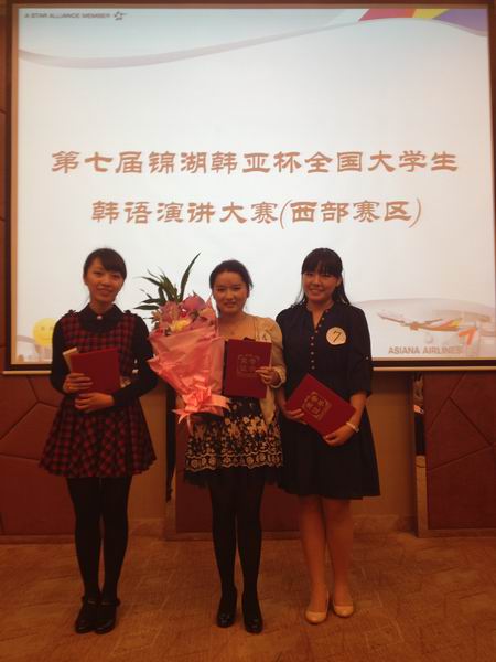 11月9日下午,由中韩两国友好协会主办,韩国锦湖韩亚集团、韩亚航空公司协办的第七届“中国大学生韩语演讲比赛(西部赛区)”在成都举行,来自8所高校的19名选手参赛参加了比赛。我院东方语系选派了2009级朝鲜语2班刘慧敏、2010级朝鲜语2班张欢、2010级朝鲜语3班王璐茜参加了比赛。
