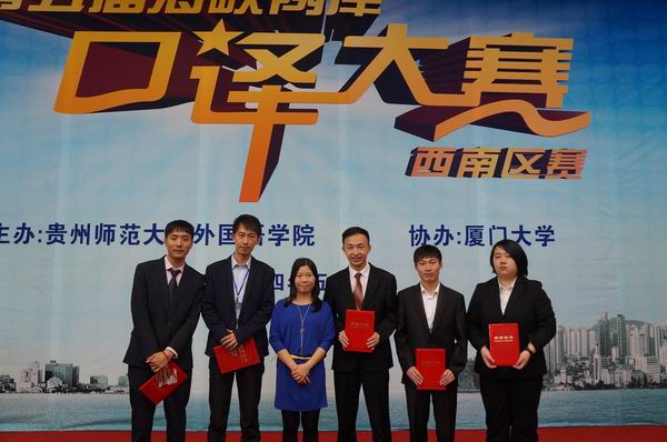 5月11日,在贵阳举行的第五届海峡两岸口译大赛西南区决赛传来喜讯,我院学子和校友在比赛中取得了优异成绩,大赛的前4名选手中3名同学来自我院,其中,我院翻译系2011级在校学生刘凯荣获一等奖,我院2013届校友、现于四川大学就读研究生的姚楠也荣获一等奖(本次大赛共评选一等奖3名,另一名为四川外国语大学的学生程霄宇),我院2013届校友、现于四川外国语大学就读研究生的樊皇以第4名的成绩获二等奖。我院翻译系2011级在校学生郭梦云获三等奖。