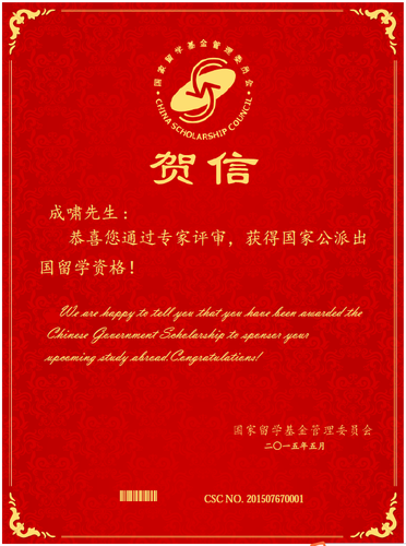 成啸获国家公派留学资格的贺信