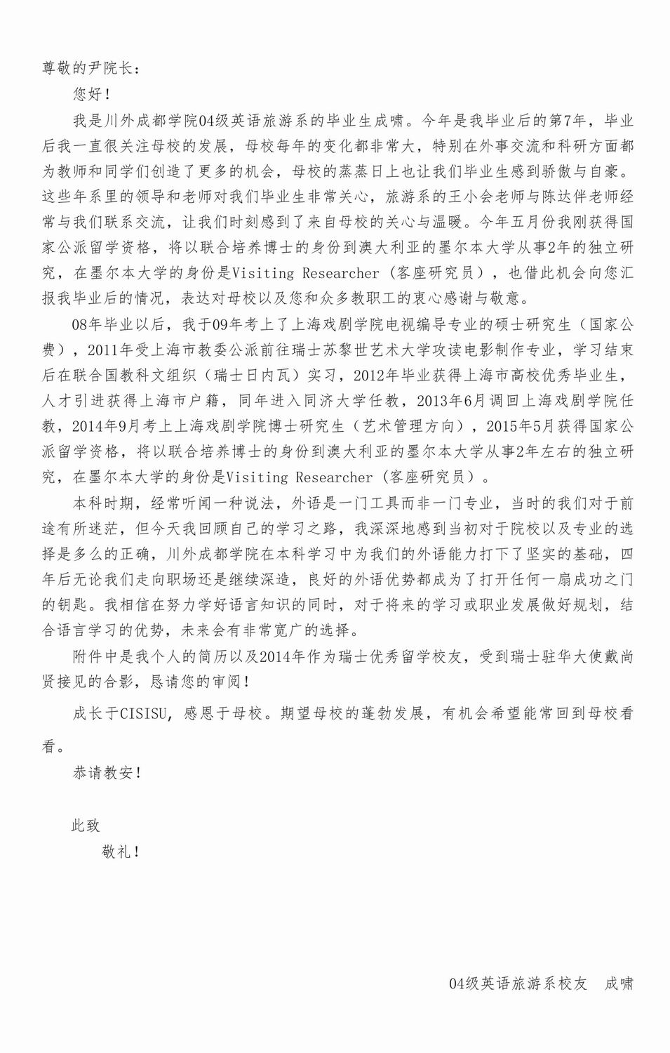 校友成啸的来信