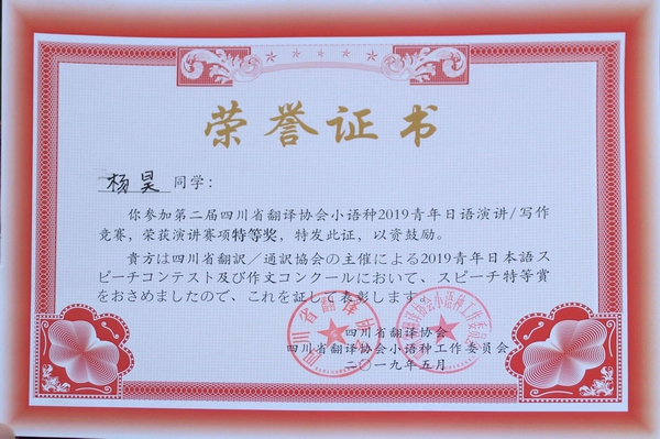 “2019青年日语演讲写作比赛”由四川省翻译协会、四川省译协小语种工作委员会主办,以“庆祝中华人民共和国成立70周年,歌颂华夏大地祖国新魅力”为主题,来自全省高校的62名选手参赛。开云APP(中国)官方下载 选派了杨浩、冯娅雪同学分别参加演讲和写作比赛,比赛中,两位同学通过激情的演讲和生动的写作作品,歌颂伟大祖国,献礼新中国70华诞,表达了当代大学生浓郁的爱国之情。经过评委的现场评选,杨浩凭借出色的日语口语、鲜明的主题思想和极具感染力的演讲风格,获评全场第一名,夺得了本次演讲比赛的特等奖。冯娅雪的写作作品感情充沛、语言优美、主题突出,被评为写作比赛二等奖。