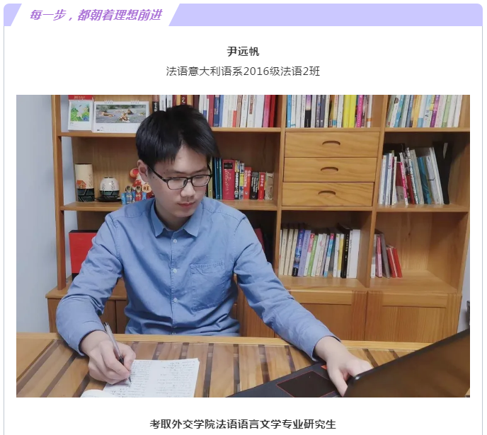 尹远帆的综合测评成绩一直是年级第一,法语专四也拿到了优秀等级,但在实现考研理想的路上,他也不敢懈怠。备考初期,他严格遵守自己的作息计划,进入冲刺阶段后,他每天五点半起床,十一点半入睡,哪怕是周末,同学们也能在楼道里看到他背书的身影。