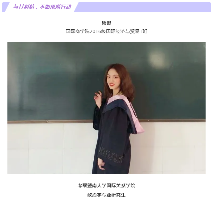 真正的努力不会骗人,杨傲最终以胜利者的姿态跑完了考研马拉松。都说考研是独自战斗,但杨傲并不觉得孤单:她从网上联系到的一位暨南大学同专业的学长,给予了她诸多备考建议,而作为国际商学院首届本科毕业生,她对学院老师全程的保驾护航,对朋友家人的问候鼓励都心存感激,但她最想感谢的,还是这一年里始终坚持的自己。