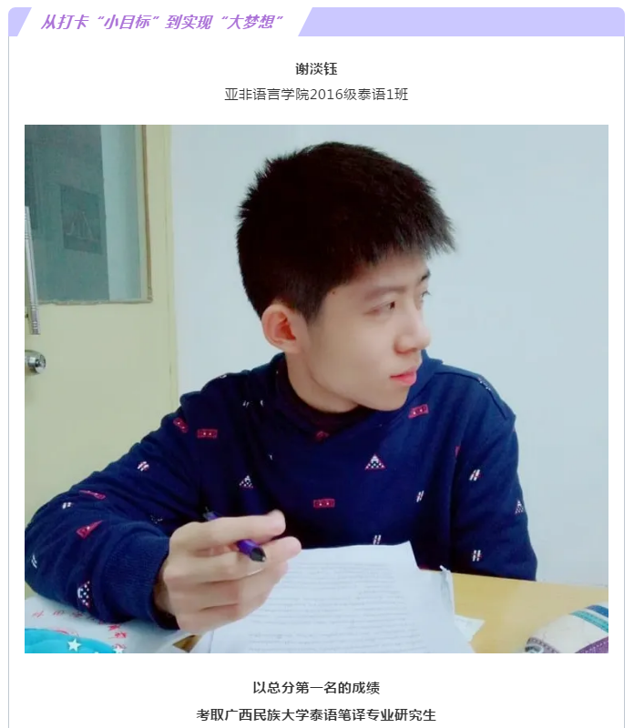得知自己以总分第一考研成功后,谢淡钰自然很开心,他想起大一刚接触泰语时,自己常被复杂的发音规则绕晕,掌握发音也比其他同学慢一两节课,还一度因此“怀疑人生”。但通过完成“每天记单词、背短语、坚持积累生活中遇到的新单词”等小目标,谢淡钰逐渐游刃有余,并最终实现了成功考研的“大梦想”。