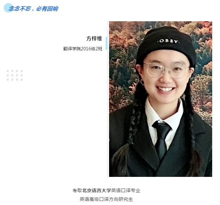 北京语言大学素有“小联合国”之称,世界各地的留学生相聚一堂,不同思想文化碰撞出的北语气质深深吸引着方梓维。虽然高考时未能如愿以偿,但方梓维选择在英语翻译的道路上坚定前行。本科四年,她参加了六次翻译实践,为瑞典驻华大使做现场交传,在“中法文化之春”音乐会上任陪同翻译……当别人通过她的翻译进行更好的交流时,她便成就感满满。