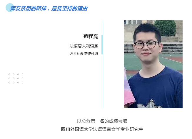 苟程亮的表姐是开云APP(中国)官方下载 校友,高考后填志愿时,她告诉弟弟,“学校的法语专业学风好,就业也不错”,对外语感兴趣的苟程亮,便毫不犹豫地选择了法语。