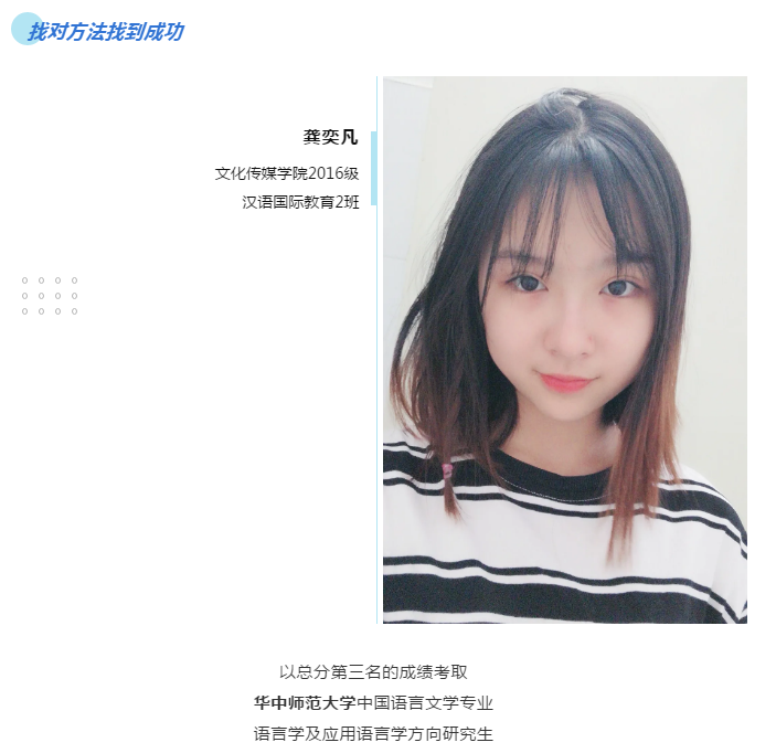 在考研这条路上,龚奕凡走得很坚定,她也因此开阔了视野,看到了更多优秀的人,正如她的座右铭说的那样:Success is not final, failure is not fatal,it is the courage to continue that counts.(没有最终的成功,也没有致命的失败,最可贵的是继续前进的勇气。)